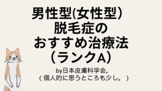 日本皮膚科学会では2017年に、男性型(女性型)脱毛症の治療法にランクをつけています。 治療法を検討した論文の質の高さや、治療実績(ずっと続いている治療法か、治療数は多いかなど)、治療に詳しい先生同士の議論、などいろいろな方面から総合的に検...